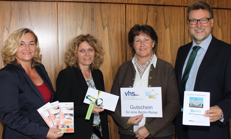 (ty) Edeltraud Grosam aus Larsbach (Zweite von rechts) ist die Gewinnerin einer Verlosung unter den Ehrenamtskarteninhabern im Landkreis Pfaffenhofen. Sie darf sich über eine Reise nach Berlin mit der Volkshochschule Pfaffenhofen freuen. Grosam engagiert sich ehrenamtlich bei der Tafel in Wolnzach. Landrat Martin Wolf (CSU) und Uschi Schlosser, die Leiterin des Koordinierungszentrums für bürgerschaftliches Engagement am Landratsamt (Zweite von links) und Ingrid Wohlsperger vom Sachbereich Ehrenamtskarte (links) gratulierten der Gewinnerin. (Foto: Schönauer)