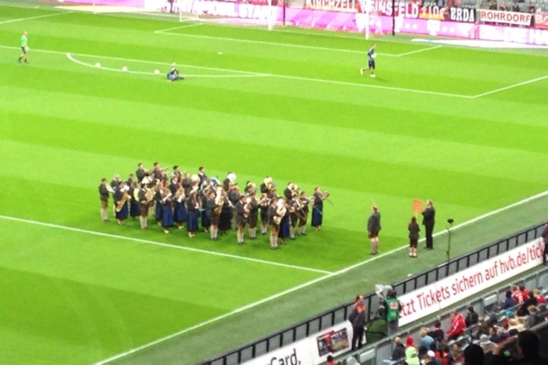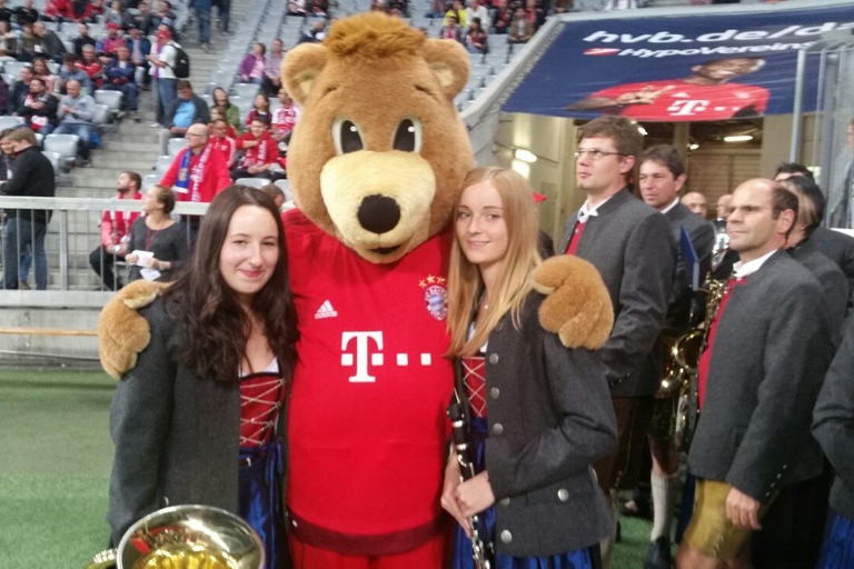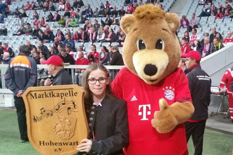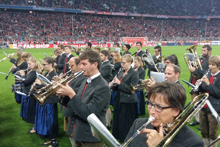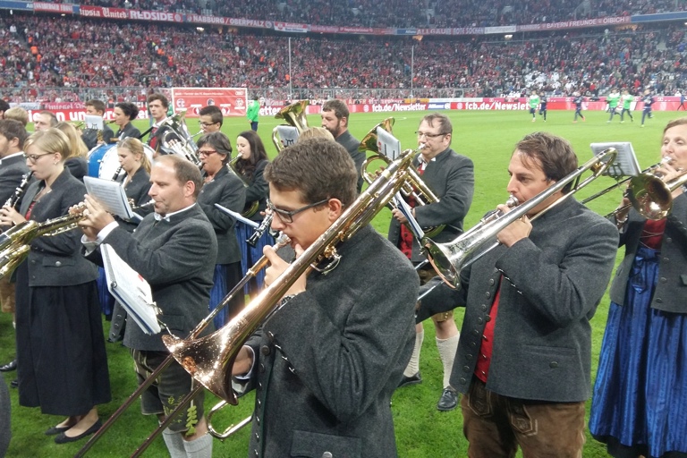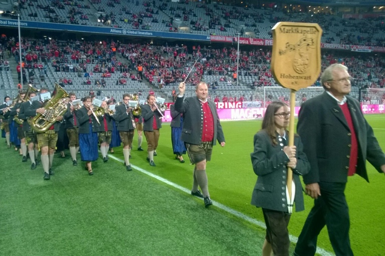 Die Hohenwarter Marktkapelle spielte gestern in der Allianz-Arena auf – und war damit Teil des historischen Fußball-Abends, an dem Stürmer Lewandowski fünf Treffer in neun Minuten erzielte