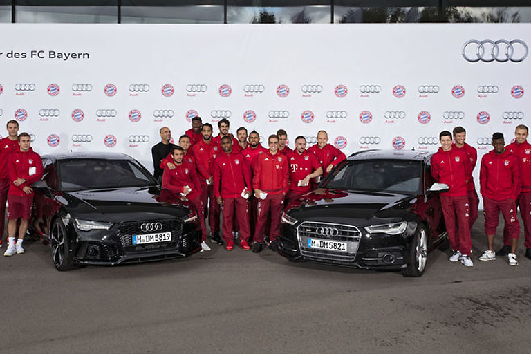 Der deutsche Rekordmeister ist seit 2002 ununterbrochen mit Audi-Modellen unterwegs. Audi hat sich 2011 als strategischer Partner an der FC Bayern München AG beteiligt und präsentiert sich bei allen Bundesliga-Spielen in der Allianz Arena, in der FC Bayern Erlebniswelt und bei anderen Veranstaltungen. Im Gegenzug besucht die Mannschaft des FC Bayern immer wieder Audi-Events. Die Leidenschaft für den Verein ist bei den Mitarbeitern tief verwurzelt: Mit mehr als 6000 Mitgliedern ist der „Audi Fanclub FC Bayern“ der größte Bayern-Fanklub der Welt.