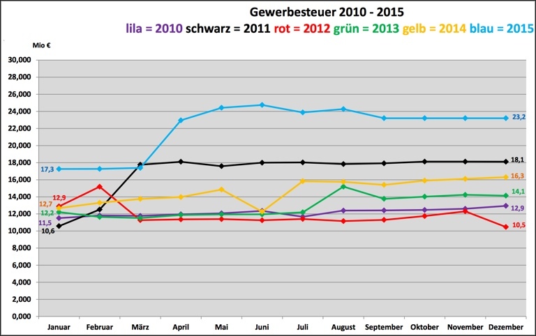 Die Gewerbesteuer-Einnahmen der vergangenen Jahre sowie die Daten und Prognosen für heuer.