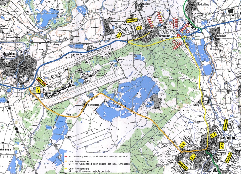 Während der zweiwöchigen Vollsperrung der Staatsstraße 2232 wird der Verkehr aus Richtung Geisenfeld kommend mit Fahrziel Ingolstadt beziehungsweise Ernsgaden über die B 300, Geisenfeldwinden, Staatsstraße 2335, Forstwiesen und B 16 umgeleitet. Der Verkehr mit Fahrziel Regensburg kann über Nötting und die neue südliche Verbindungsrampe der Staatsstraße 2232 zur B 16 fahren. Der Verkehr aus Richtung Ernsgaden kommend mit Fahrziel Geisenfeld wird über die Kreisstraße PAF 17, Anschlussstelle Ernsgaden-West, B 16, Anschlussstelle Ernsgaden-Ost und die neue Verbindungsrampe von B 16 und Staatsstraße 2232 zurück zur Staatsstraße 2232 nach Geisenfeld geleitet. Die Umleitungen sind freilich örtlich beschildert.