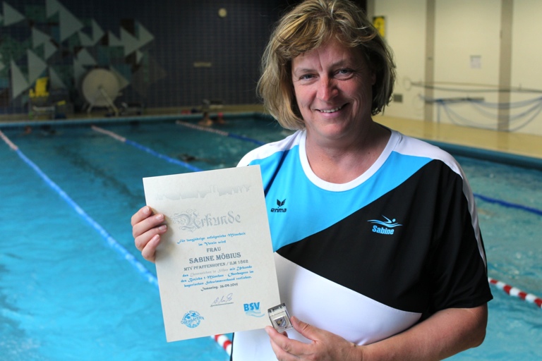 (fle) Beim Ehrenabend des Bezirks I München-Oberbayern in Ismaning wurde Sabine Möbius (Foto) für ihre besonderen Verdienste um den Schwimmsport mit der silbernen Ehrennadel ausgezeichnet. Neben ihren Tätigkeiten in der Schwimmabteilung des MTV Pfaffenhofen als Kassier und Talentscout setzt sie vor allem mit ihrer Schwimmschule das Motto des Bayerischen Schwimmverbands „Unsere Kinder müssen Schwimmen lernen“ in herausragender Weise um.