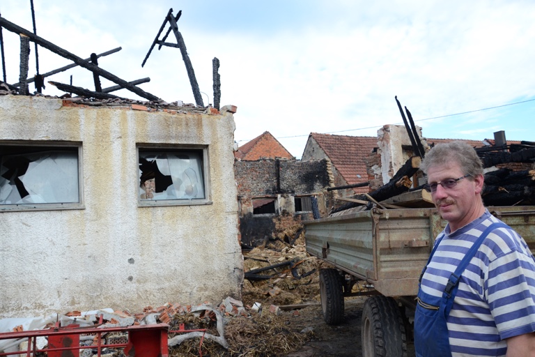 Herbert Schäffer vor dem Ende August abgebrannten Gebäudekomplex. Das Foto entstand Mitte September, als er sich über unsere Zeitung bei den zahlreichen Helfern bedanken wollte. Heute Abend mussten sie erneut anrücken.