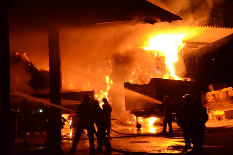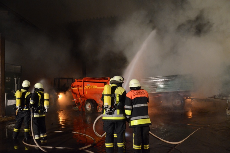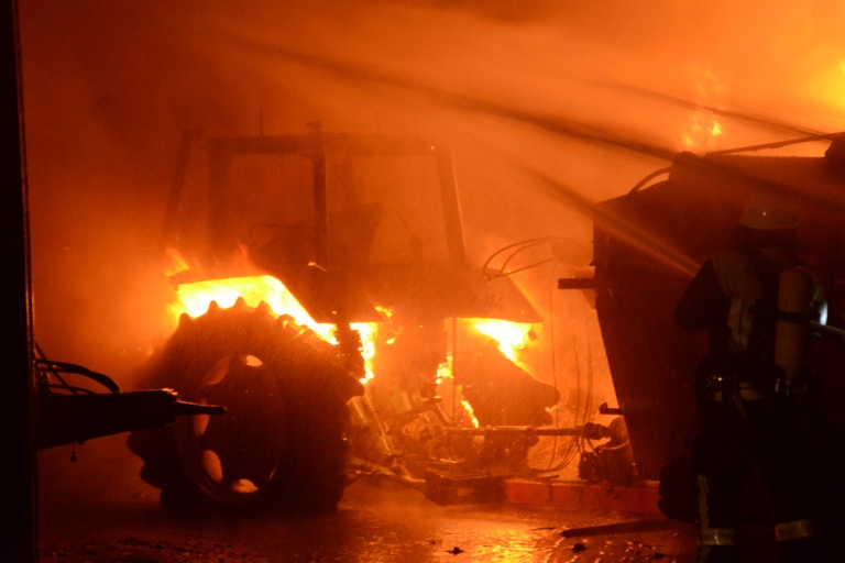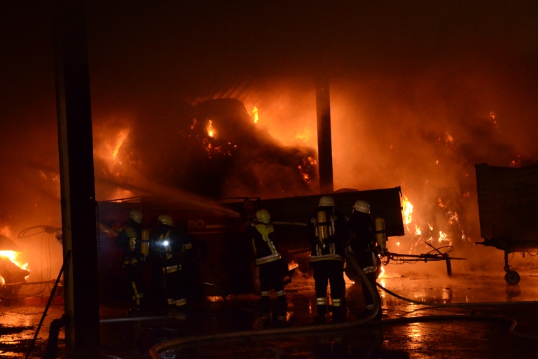 Bei den beiden überdachten Bauwerken die jetzt in Flammen geraten sind – eines ist bereits einsturzgefährdet –, handelt es sich um einen Unterstand und um ein großes Strohlager. Das Stroh – eine riesige Menge – brennt lichterloh, während auch mehrere landwirtschaftliche Maschinen von dem Feuer zerstört worden sind. Darunter augenscheinlich ein Traktor, eine Erntemaschine und ein Anhänger. Das Ausmaß war zunächst gar nicht abzusehen.