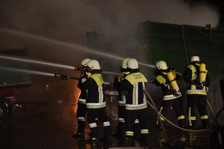 Die Feuerwehren aus Hettenshausen, Ilmmünster, Scheyern, Winden bei Scheyern und Pfaffenhofen bekämpfen von allen Seiten das Feuer. Dabei gilt es vor allem, ein Ausbreiten der Flammen auf anliegende Gebäude sowie auf den direkt angebauten Stall zu verhindern. In dem Stall waren zahlreiche Kühe untergebracht. Einige von ihnen konnten auf der vom Feuer abgewandten Seite aus dem Gebäude auf eine Wiese ins Freie gebracht werden. Einige der Rinder befindet sich noch im Stall, während ein paar Feuerwehrler nur ein paar Meter neben ihnen stehen und durch die Stallfenster hindurch Wasser in den von dem Brand betroffenen Unterstand spritze, um auch von dieser Seite das Feuer bekämpfen zu können und ein Übergreifen zu verhindern.