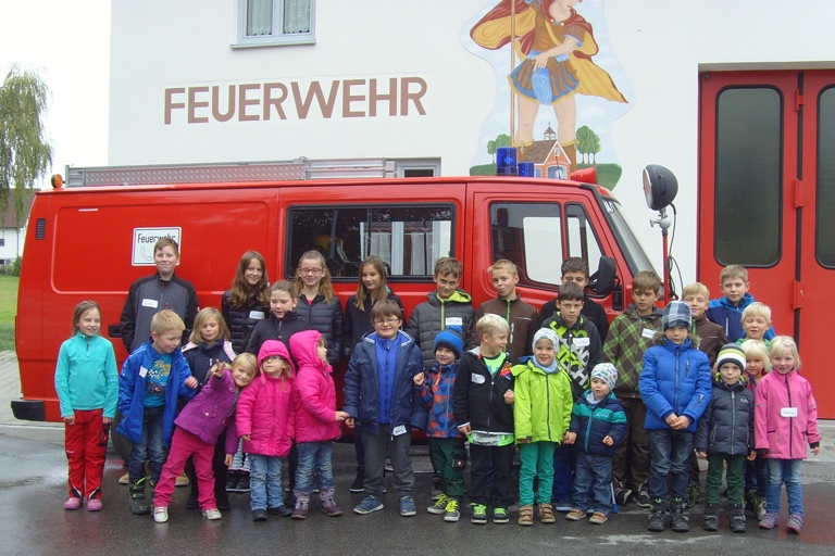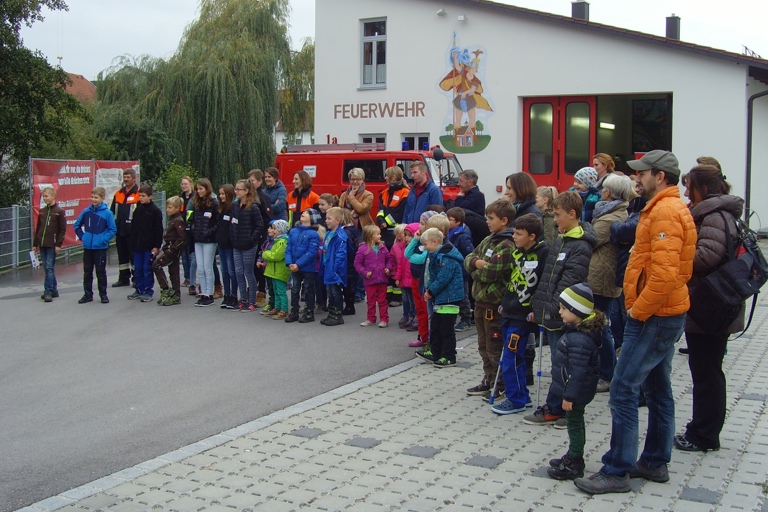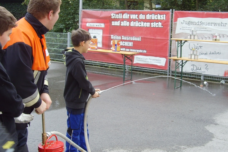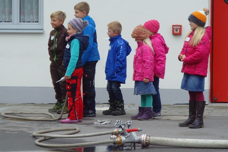 An diesem Nachmittag wurde den Kindern erläutert, wie man sich im Brandfall in einem Gebäude richtig verhält und was dann die Feuerwehr so alles unternimmt, wenn sie zur Bekämpfung eines Brandes anrückt. Außerdem ging es um den Umgang mit einem Feuerwehrschlauch – und die Kinder durften sich im Umspritzen von Dosen versuchen. Dann stand „Fahrzeugkunde“ inklusive Spritztour auf dem Programm.