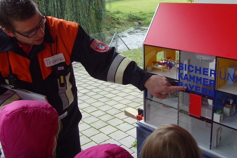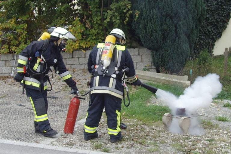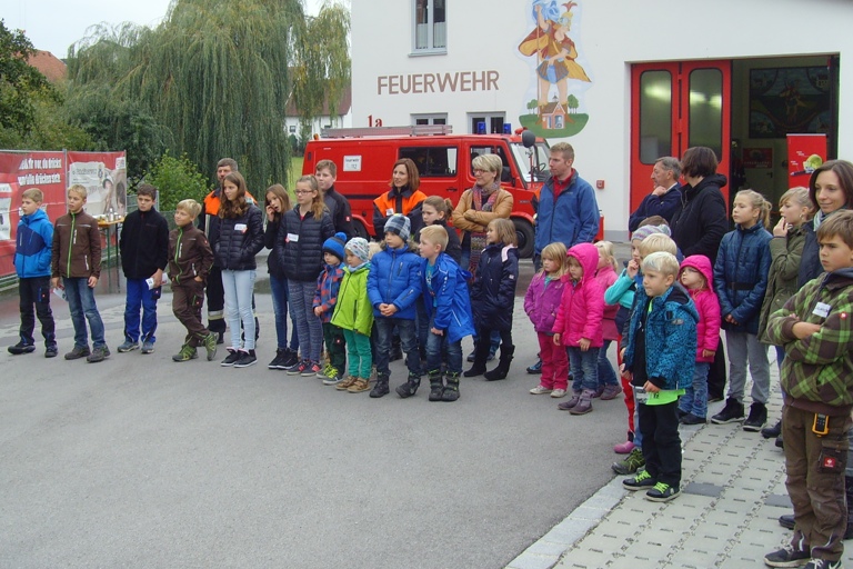 Weiter ging es mit Erster Hilfe: Anhand eines simulierten Treppensturzes wurde erläutert und gezeigt, wie sich die Kinder verhalten sollen, wenn niemand sonst zu Hause ist, der dem Verunglückten helfen kann. Das Gelernte stellten sie dann bei einer Übung auch gleich unter Beweis. Freilich wurde den Buben und Mädchen auch die Kleidung und Ausrüstung eines Feuerwehrlers erklärt – mit Vorführung eines Atemschutzgeräteträgers. Gezeigt wurde auch, wie man sich bei einem Fettbrand richtig verhält. Wichtig vor allem: Niemals mit Wasser löschen! Schließlich wurden den Kindern ihre Urkunden verliehen – auf denen ist auch nachzulesen, was sie alles gelernt haben.