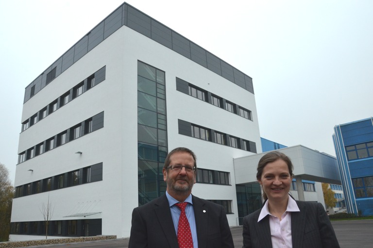 Daiichi-Sankyo-Werksleiter Frank Knefeli und Nora Urbanetz, die Leiterin der pharmazeutischen Entwicklung, vor dem neuen, würfelförmigen Gebäude, das für 13 Millionen Euro errichtet wurde.