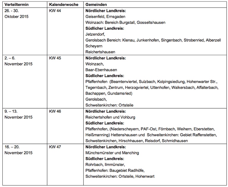 (ty) Bei der Leerung der Restmüll-, Bioabfall- und Papiertonnen kommt es in den Gemeinden im südlichen Landkreis Pfaffenhofen im kommenden Jahr zu zahlreichen Änderungen. Wie der Abfallwirtschaftsbetrieb des Landkreises (AWP) auf Anfrage unserer Zeitung mitteilt, ändert sich damit für viele Haushalte sowohl der Leerungstag als auch die Leerungswoche. Betroffen davon sind nach Angaben des AWP die Gemeinden Gerolsbach, Hettenshausen, Hohenwart, Ilmmünster, Jetzendorf, Pfaffenhofen, Pörnbach, Reichertshausen, Rohrbach, Scheyern und Schweitenkirchen. Die genauen Infos sind dem Abfuhr-Terminplan für das nächste Jahr zu entnehmen, der in den kommenden Wochen landkreisweit verteilt wird.