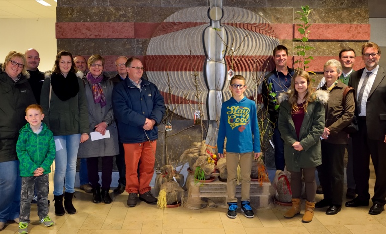 (ty) Landrat Martin Wolf überreichte im Foyer des Pfaffenhofener Landratsamts die Preise an die Gewinner des Obstquiz anlässlich der diesjährigen Obstpräsentation. Zu gewinnen gab es verschiedene Beerensträucher und Obstbäume. „Auch der private Obstbau braucht Fachwissen“, freute sich der Landrat über viele richtige Antworten. Äpfel, Birnen und Quitten aus dem eigenen Garten können beispielsweise erfolgreich versaftet werden. „Bessere Saftqualität finden Sie nirgends“, sagt Kreisfachberater Andreas Kastner.
