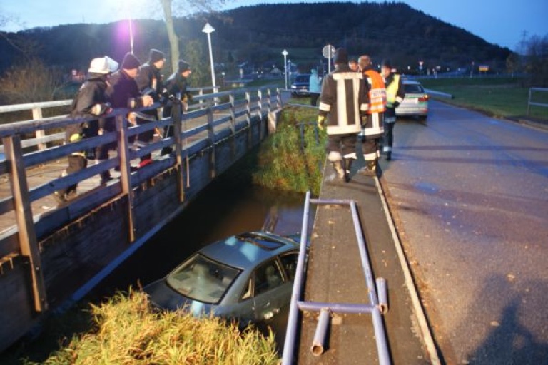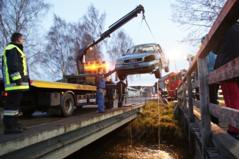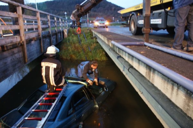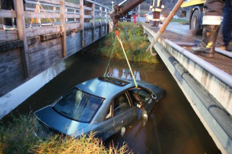 Das Brückengeländer war bei dem Crash fast vollständig abgebrochen. Das Unfall-Auto wurde von einem Abschleppwagen, der mit einem Kran ausgestattet ist, aus dem Wasser gehoben und abtransportiert. Nach ersten Schätzungen der Polizei wird der Schaden auf 4000 Euro beziffert.