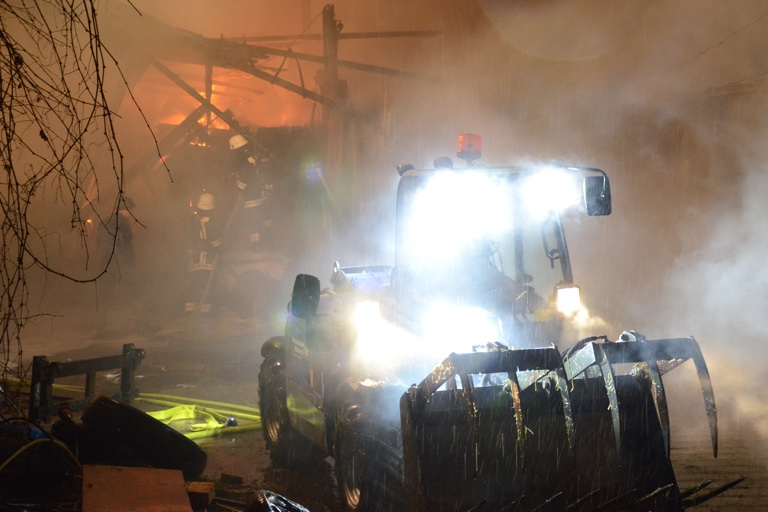 (zel) Die Einsatzkräfte richten sich auf eine arbeitsreiche Nacht in Hettenshausen ein. Die Löscharbeiten auf dem Hof von Herbert Schäffer gehen einmal mehr direkt in die Nachlösch- und Aufräumarbeiten über. Schweres Gerät ist im Einsatz, während weiterhin dichter Rauch in die von Scheinwerfern erhellte Dunkelheit steigt. Die ganze Nacht über werden Feuerwehrleute, THW-Kräfte und weitere Helfer beschäftigt sein.
