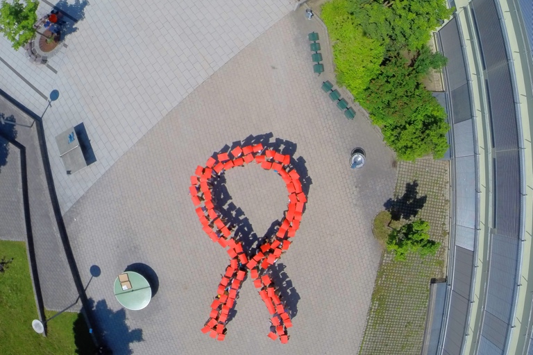 (ty) Anlässlich des Welt-Aids-Tags am 1. Dezember veranstaltete das Gesundheitsamt Pfaffenhofen nach Aufruf durch die psychosoziale Aids-Beratungsstelle der Caritas München eine besondere Fotoaktion: Ein Hexacopter fotografierte eine leuchtend rote Aids-Schleife, gebildet von 90 Schülern des Hallertau-Gymnasiums Wolnzach, aus luftiger Höhe.