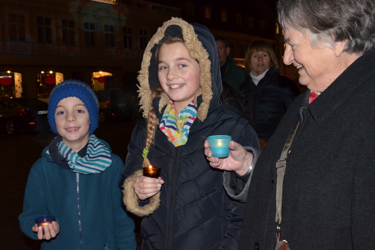 Wer aufmerksam durch die Stadt ging, konnte im Rahmen der Lichterketten-Aktion viele kleine, schöne Momente einfangen. Da war die Oma mit ihren Enkelkindern. Da war die Rentnerin, die eine kleine Laterne an ihrem Rollator befestigt hatte, um ebenfalls ein Zeichen für den Frieden zu setzen. Da waren immer wieder einzelne Kerzen am Wegesrand, die zeigten, wo die Lichterkette verläuft. Und in der Georg-Hipp-Straße waren auf dem Gehweg so viele Lichter postiert, dass sich ein ganz besonderes Bild ergab.