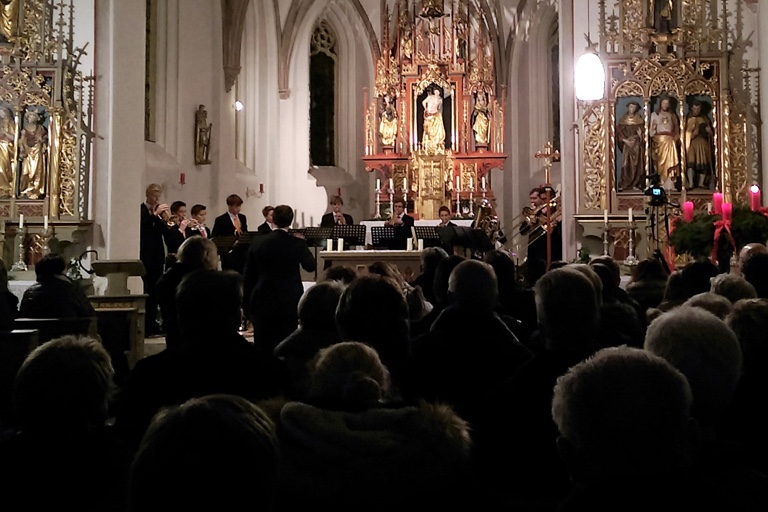 Das Repertoire reichte vom 16. Jahrhundert bis in die Gegenwart und von deutschen Meistern bis in alle Welt. Alpenländische Weihnachtsklänge interpretierte das junge zwölfköpfige Ensemble dabei genauso stimmungsvoll und sicher wie Stücke aus Frankreich, Spanien, Italien oder England, etwa auch den bekannten Christmas-Song aus der englischen Comedy-Serie um Mr. Bean. Beim „Herrscher des Himmels“ aus dem Weihnachtsoratorium von Johann Sebastian Bach schien die Uttenhofener Pfarrkirche St. Sebastian ob der Klanggewalt der jungen Bläser sogar fast ein wenig zu erzittern.