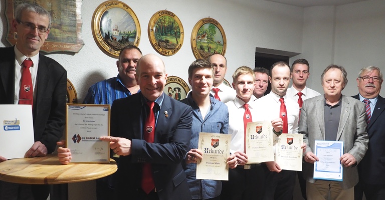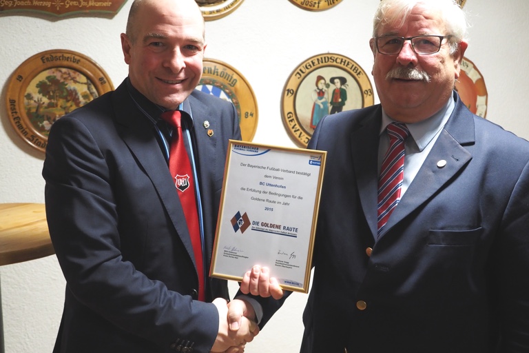 (ind) Zur Weihnachtsfeier des BC Uttenhofen brachte der Kreisvorsitzende des Bayerischen Fußball-Verbands (BFV), Horst Kaindl, ein besonderes Geschenk mit: Bereits zum zweiten Mal wurde der kleine Pfaffenhofener Ortsteilverein mit der Goldenen Raute des BFV ausgezeichnet. Besonders stolz dürfen die BCU-Akteure darauf sein, denn bisher wurde nur vier von über 200 Fußballklubs im gesamten Kreis Donau/Isar diese hohe Ehre zuteil.