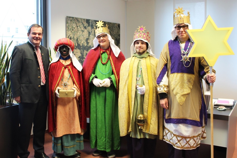 (ty) Die Sternsinger der Pfaffenhofener Stadtpfarrkirche St. Johannes Baptist kamen auch heuer in der Stadtverwaltung vorbei, um Glück- und Segenswünsche für alle Mitarbeiter und Besucher der Verwaltung zu überbringen. Vize-Bürgermeister Albert Gürtner (FW) begrüßte die „Heiligen Drei Könige“ und den Sternträger, die von Heinz Böhm begleitet wurden. Unter dem Motto „Respekt für dich, für mich, für andere – in Bolivien und weltweit“ sammeln die Sternsinger heuer Spenden für Kinder-Hilfsprojekte.