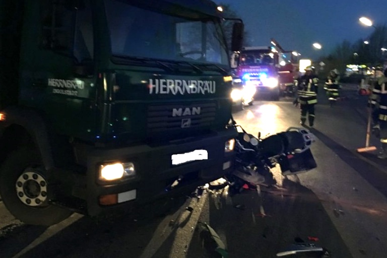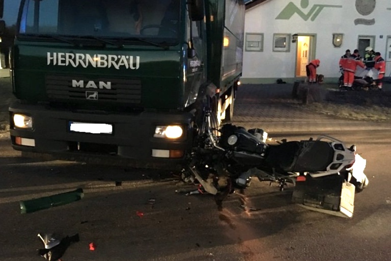 Der Unfall ereignete sich gegen 7 Uhr auf der Münchener Straße. Nach Angaben der Polizei wollte der Lastwagen von einem Grundstück auf die Straße ausfahren und befand sich bereits zirka einen Meter auf der Fahrbahn, wo er stehen blieb. Der Motorradfahrer, der ortsauswärts unterwegs war, hat laut Polizei offenbar aufgrund seines beschlagenen Visiers den bereits stehenden Laster übersehen und prallte auf Höhe der Fahrertür gegen diesen.