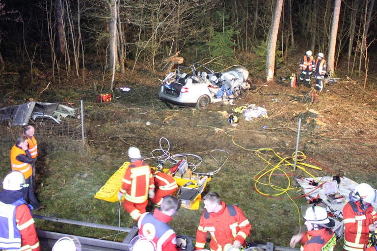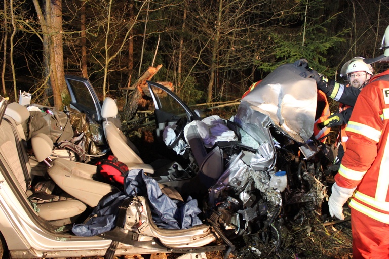 Pkw kam von der Autobahn ab, rammte zwei Bäume und krachte gegen einen Stumpf – Beifahrerin (54) eingeklemmt und mittelschwer verletzt, Fahrer (58) kam mit leichteren Blessuren davon