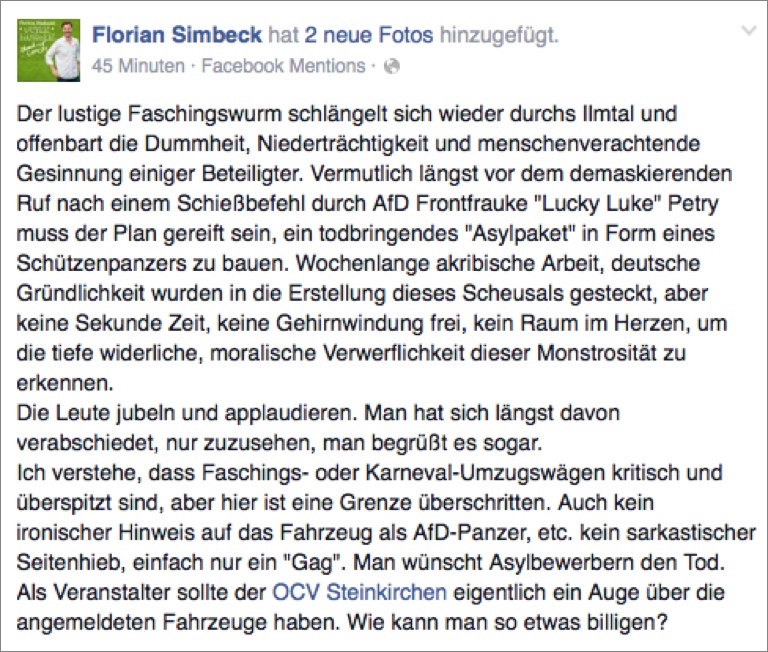 Noch deutlicher wurde der Reichertshausener SPD-Kreisrat Florian Simbeck. „Der lustige Faschingswurm schlängelt sich wieder durchs Ilmtal und offenbart die Dummheit, Niederträchtigkeit und menschenverachtende Gesinnung einiger Beteiligter“, schimpft er. Wochenlange akribische Arbeit und deutsche Gründlichkeit seien in die Erstellung dieses Scheusals – sprich: Panzers – gesteckt worden, „aber keine Sekunde Zeit, keine Gehirnwindung frei, kein Raum im Herzen, um die tiefe widerliche, moralische Verwerflichkeit dieser Monstrosität zu erkennen“. Und weiter kritisiert Simbeck: „Die Leute jubeln und applaudieren. Man hat sich längst davon verabschiedet, nur zuzusehen, man begrüßt es sogar.“ Er verstehe, dass Faschings- oder Karneval-Umzugswägen kritisch und überspitzt seien, aber hier ist seiner Meinung nach eine Grenze überschritten.