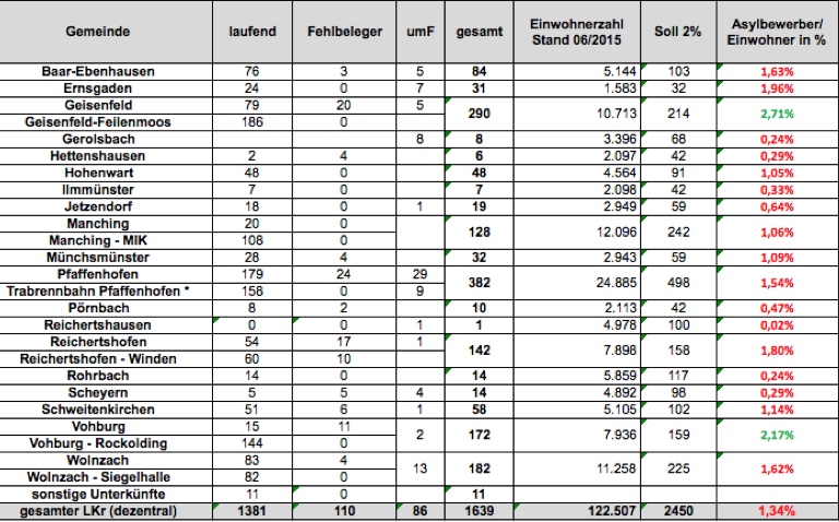 Stand heute erfüllen der Aufstellung des Landratsamts zufolge überhaupt erst zwei der 19 Kommunen die Zwei-Prozent-Quote: Geisenfeld und Vohburg. Bei allen anderen fehlt es zum Teil noch gewaltig. So hat zum Beispiel Gerolsbach erst acht Flüchtlinge aufgenommen, die Quote sähe aber 68 vor. Auch Ilmmünster (Ist: 7, Soll: 42), Hettenshausen (6/42) Pörnbach (10/42), Rohrbach (14/117), Scheyern (14/98) oder Jetzendorf (19/59) hinken gewaltig hinterher. Ganz zu Schweigen von Reichertshausen, wo derzeit ein Flüchtling lebt, aber 100 aufzunehmen wären.
