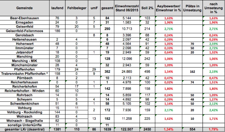Aktuelle Situation in Sachen Asylbewerber-Unterbringung und geplante Unterkünfte im Landkreis. Zur Erklärung: Die Flüchtlingen auf dem Pfaffenhofener Trabrennbahn-Gelände werden der Stadt zu 50 Prozent angerechnet. Die Abkürzung "umF" steht für "unbegleitete minderjährige Flüchtlinge".