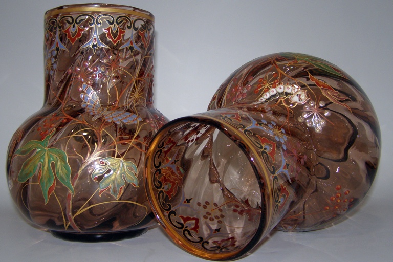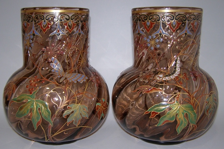 Die beiden Vasen sind jeweils zirka 24 Zentimeter hoch, aus braun-transparentem Glas, in Rippenoptik geblasen und leicht gedreht. Umlaufend weisen sie ein polychromes, emailliertes und vergoldetes Dekor auf, das die Verwandlung von der Raupe zum Schmetterling in floralem Umfeld zeigt. Die beiden Vasen sind nicht nur außergewöhnlichen selten, sondern auch sehr gut erhalten.