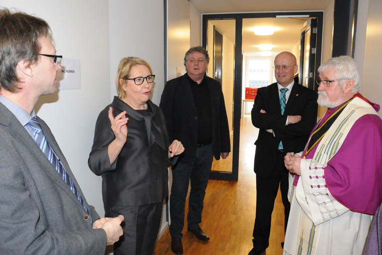 (ty) Seit November ist das neue Caritas-Frauenhaus in Betrieb, heute ist es offiziell eingeweiht worden. Caritasdirektor Franz Mattes segnete das Gebäude im Rahmen einer kleinen Feier mit knapp 20 Gästen aus Politik, Kirche und Caritas. Einrichtungsleiterin Marianne Frinken zeigte sich nach den ersten Wochen vor allem mit dem „flexiblen guten Raumkonzept“ zufrieden. „Jetzt wollen wir das Haus mit Leben und Beratung füllen“, erklärte Frau Frinken. Gemeinsam mit dem beauftragten Architekten Alfons Schlamp und ihrem Team stellte sie die neuen Räume bei einem Rundgang vor.
