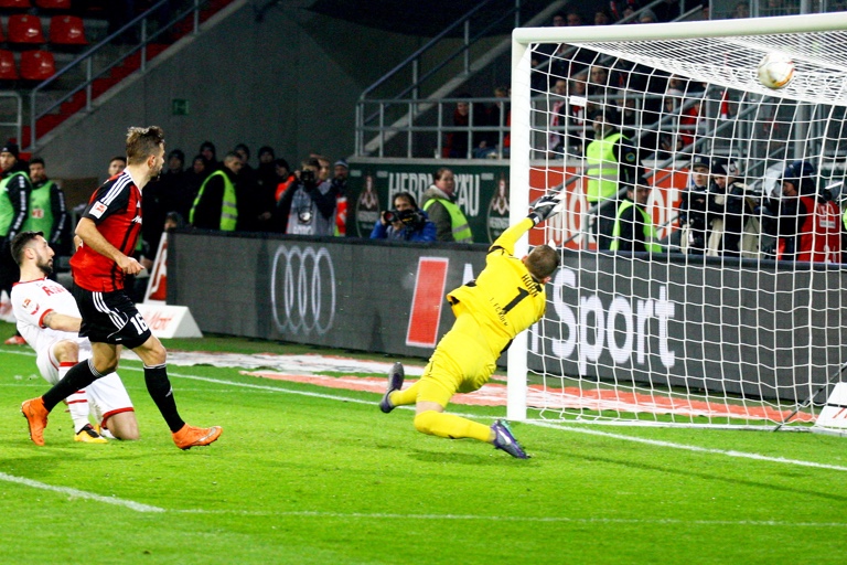 Die Schanzer waren nach einer verhaltenen Anfangsphase langsam, aber unübersehbar besser ins Spiel gekommen. Und schließlich führte in der 36. Minute der erste richtig vorgetragene Angriff zum Führungstreffer für die Gastgeber. Mittelfeld-Regisseur Pascal Groß setzte den aufgerückten Außenverteidiger Danny da Costa auf der rechten Seite perfekt in Szene, der brachte eine scharfe Hereingabe in den Strafraum – und Lukas Hinterseer, der in Position gelaufen war, tat, was ein Stürmer tun muss: Er hielt den Fuß hin und drückte die Kugel unbeirrt zu seinem vierten Saisontor in die Maschen. Kölns Keeper Timo Horn war hier chancenlos.