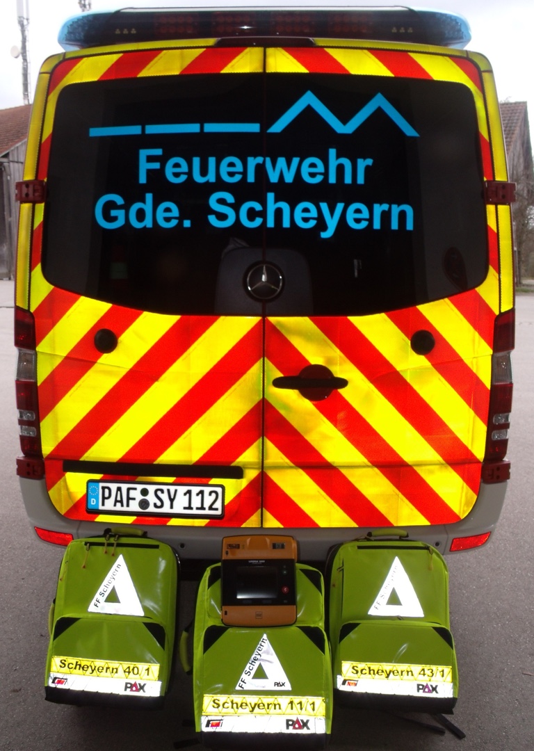 „Zur Ausstattung gehören neben umfangreichem Verbandsmaterial auch Halskrausen sowie Material zur Reanimation wie zum Beispiel ein Beatmungsbeutel“, erklärt ein Sprecher der Feuerwehr. Im Rahmen der Indienststellung des neuen Mehrzweckfahrzeuges wurde vom Feuerwehrverein aus Eigenmitteln zudem ein AED (Automatischer Externer Defibrillator) beschafft, der nunmehr in dem Fahrzeug mitgeführt wird. „Bei der Beschaffung wurde eng mit dem Bayerischen Roten Kreuz zusammengearbeitet, um die größtmögliche Kompatibilität zwischen Feuerwehr und Rettungsdienst zu gewährleisten“, heißt es dazu. Aus diesem Grund beschaffte die Feuerwehr Scheyern einen AED, der auf allen Krankenwagen des BRK in Bayern zur Ausstattung gehört.