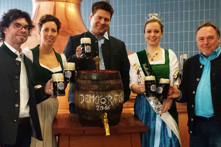 (ty) Im Sudhaus der hiesigen Brauerei Müllerbräu durfte SPD-Stadträtin und Festwirtin Julia Spitzenberger gemeinsam mit der Hallertauer Hopfenkönigin Anna Roßmeier und SPD-Chef Markus Käser bereits den extra für das Pfaffenhofener SPD-Starkbierfest am kommenden Freitag abgefüllten "Demokrator" testen. Braumeister Alexander Büch zapfte die erste Halbe des naturtrüben Doppel-Bocks direkt aus dem Fass. Der spezielle Sud wird in dieser Form nur beim Starkbierfest der Sozis in der Kreisstadt ausgeschenkt.