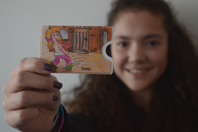 Andrea Hiller hat die Knax-Figur „Dodo“ auf den Kartenhüllen verewigt, Nina Langes Motiv zeigt eine Weltkugel mit dem Sparkassen-S. Stolz erklärte Andrea gestern ihr Werk, schilderte, wie sie auf das Motiv gekommen war und es dann umgesetzt hat. So erfuhr man, dass Andrea einst schon ihrem Lieblings-Kuscheltier den Namen „Dodo“ gab, denn „Dodo“ ist auch ihre liebste Figur in dem monatlich erscheinenden Knax-Comic-Heft der Sparkasse. Abgepaust hat Andrea übrigens nicht. Das hat sie auch nicht nötig bei Schulnote 1 in Kunst.