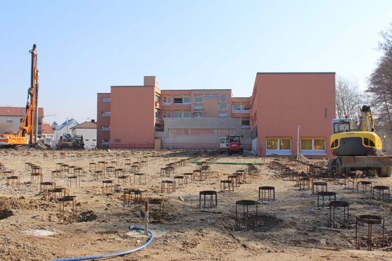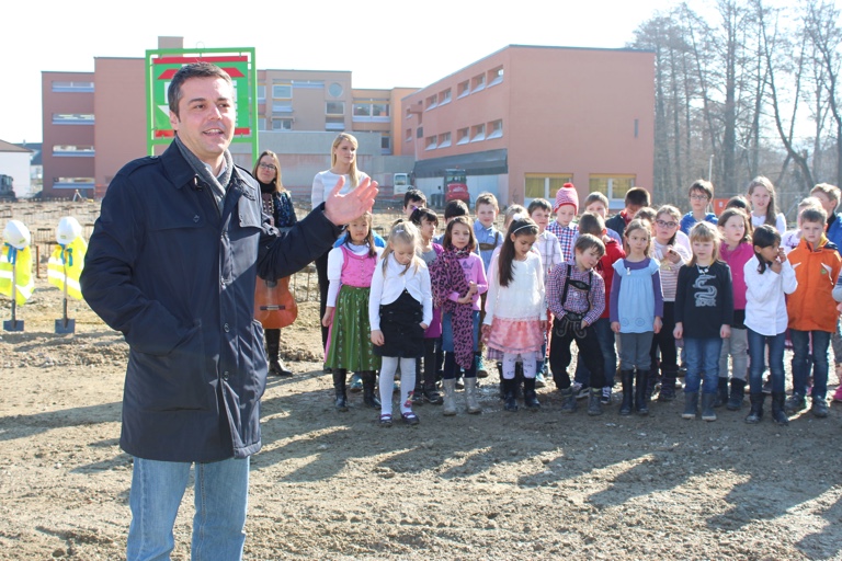 Mit einem bayerischen Lied „Wos brauch ma in am Schulhaus?“ unterhielten die Klassen 1b und 3a mit ihren Lehrerinnen Claudia Kanzler und Veronika Billmann die Gäste, die zu dem Spatenstich gekommen waren. Eine der Schülerinnen nahm dann auch aktiv an dem symbolischen Akt teil. Neben Bürgermeister Herker und Vize-Landrat Anton Westner (CSU) waren auch weitere Vertreter von Stadt und Stadtrat, der Planer und Architekten sowie der Schulleitung und der Lehrkräfte, des Elternbeirats und der Schülermitverwaltung anwesend.