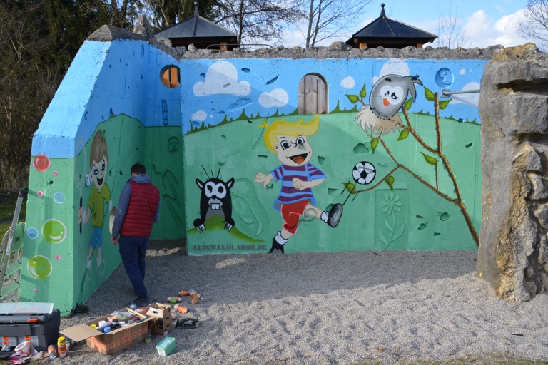 (ty) Bunt gestaltet werden derzeit die Wände des Abenteuer-Spielplatzes in Ilmmünster vom Graffiti-Künstler Marcel Pfeilschifter von Leinwandlabor.de. Mit großer Kreativität und in vielen ehrenamtlichen Stunden gestaltet er die Mauern fröhlich und bunt.