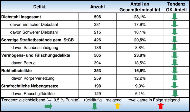 Der Großteil der Kriminalität im Bereich der Pfaffenhofener Inspektion wird von nachfolgenden Deliktsarten geprägt. Die Pfeile geben die Veränderung in der „Kriminalitätsstruktur“ an, also des Prozentanteils an der Gesamtkriminalität. Dabei ist erfreulicherweise festzustellen, dass alle Bereiche rückläufig sind.