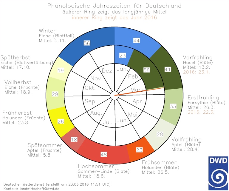 Aus den Eintrittszeiten charakteristischer Vegetationsstadien kann das phänologische Jahr konstruiert und in einer so genannten phänologischen Uhr darstellt werden. Jede phänologische Jahreszeit wird durch eine Leitphase eröffnet und endet mit dem Beginn der nächsten Jahreszeit. Im äußeren Ring der hier dargestellten phänologischen Doppeluhr ist der langjährige mittlere Verlauf der phänologischen Jahreszeiten dargestellt. Im Vergleich dazu ist der aktuelle Verlauf der phänologischen Jahreszeiten im inneren Ring abgebildet.