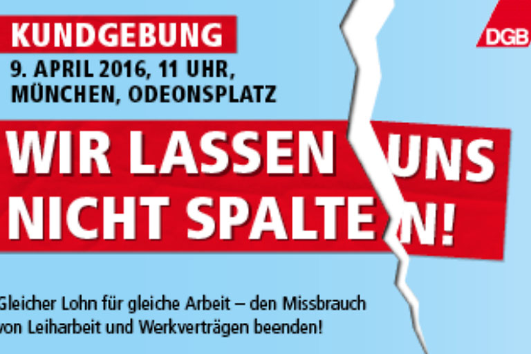 „Hunderttausende Kollegen werden schlechter bezahlt und schlechter behandelt als die Stammbelegschaft. Und damit zum Lohndumping missbraucht“, so die Gewerkschaft. Dabei hätten Union und SPD im Koalitionsvertrag zugesagt, den Missbrauch von Werkverträgen und Leiharbeit zu verhindern. „Der Gesetzentwurf wurde von der CSU gestoppt. Jetzt bekommen die Arbeitnehmerinnen und Arbeitnehmer nichts“, so der DGB, der die Position der CSU nicht akzeptiert und deswegen am 9. April ab 11 Uhr am Odeonsplatz in München zu einer Kundgebung aufruft.