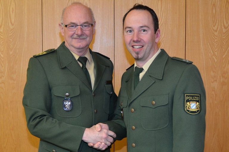 Polizeipräsident Walter Kimmelzwinger (links) begrüßt Polizeioberkommissar Christian Asner offiziell als neuen Leiter der Inspektion Geisenfeld.
