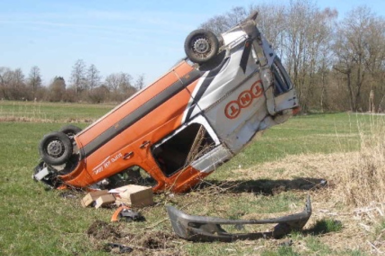 (ty) Einen spektakulären Crash hat gestern Vormittag ein 24-jähriger Paketzusteller im Kreis Freising hingelegt. Während an seinem Transporter, der nach dem Überschlag auf dem Dach liegen blieb, ein Totalschaden zu beklagen ist, kam der junge Mann nach Angaben der Polizei mit leichten Verletzungen davon. Er hat mächtig Glück gehabt, wie man auch anhand des Fotos erkennen kann.