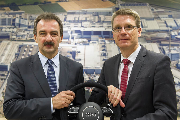 (ty) Fred Schulze überreichte symbolisch das Steuer an seinen Nachfolger Albert Mayer, der seit 1. April das Audi-Werk in Ingolstadt leitet. Mayer begann 1979 seine Laufbahn bei Audi in Ingolstadt und war zuletzt Chef der Produktions‑ und Werkplanung. Sein Vorgänger Fred Schulze ist seit 1993 bei Audi tätig und verantwortet nun als Baureihenleiter alle Oberklasse-SUV der Marke.