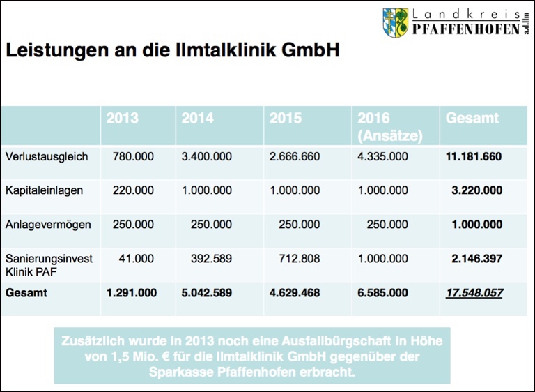 - Die weiterhin defizitäre Ilmtalklinik-GmbH mit ihren Krankenhäusern in Pfaffenhofen und Mainburg wird den Landkreis Pfaffenhofen heuer 6,6 Millionen Euro kosten. Bekanntlich hat die Klinik-GmbH im vergangenen Jahr ein Minus von 5,1 Millionen Euro gemacht – das von den Trägern (Kreis Pfaffenhofen: 85 Prozent; Kreis Kelheim: 15 Prozent) entsprechend ihrer Anteile aufzufangen ist. Allein dieser Defizit-Ausgleich kostet den Kreis Pfaffenhofen somit heuer 4,34 Millionen Euro. Hinzu kommen eine Kapital-Einlage von einer Million und ein Sanierungs-Investment in den Brandschutz in Pfaffenhofen von einer weiteren Million. Plus 250 000 Euro, die in das Anlage-Vermögen gesteckt werden – ergibt unterm Strich 6,6 Millionen Euro. Damit hätte der Landkreis Pfaffenhofen in den Jahren 2013 bis 2016 insgesamt 17,55 Millionen Euro in die Klinik-GmbH gesteckt.