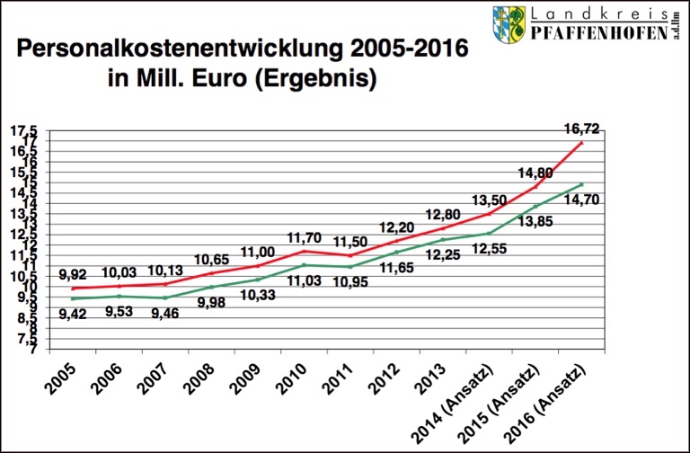 Die Personalkosten des Landkreises schnellen weiter in die Höhe: Rot die gesamten Ausgaben, grün die Ausgaben nach Abzug der Zuschüsse.