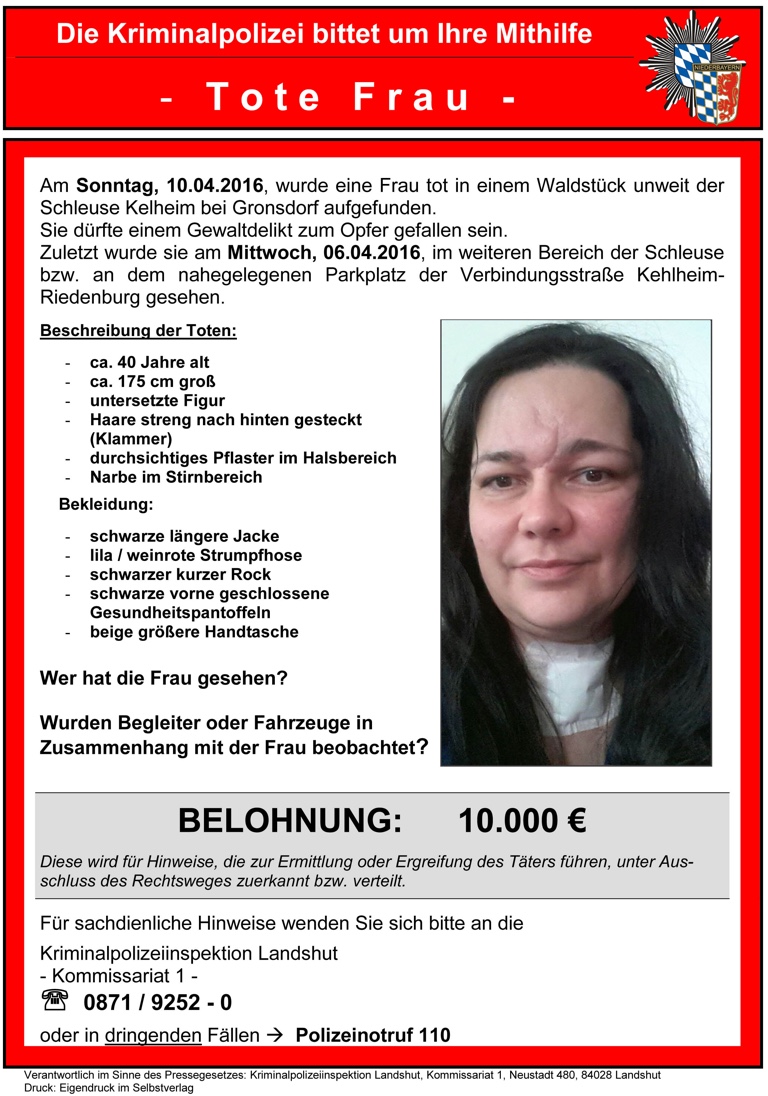 (ty) Wie berichtet, ist am Sonntag, 10. April, die Leiche einer 40-Jährigen aus Riedenburg in einem Waldstück bei der Main-Donau-Kanal-Schleuse Kelheim-Grondsdorf entdeckt worden. Die Ermittler gehen davon aus, dass die Frau einem Gewaltverbrechen zum Opfer gefallen ist. Die Ermittlungen laufen auf Hochtouren, dabei hofft die Kripo auch auf Hinweise aus der Bevölkerung. Für Hinweise, die zur Ermittlung oder Ergreifung des Täters führen, ist jetzt eine Belohnung in Höhe von 10 000 Euro ausgelobt worden.