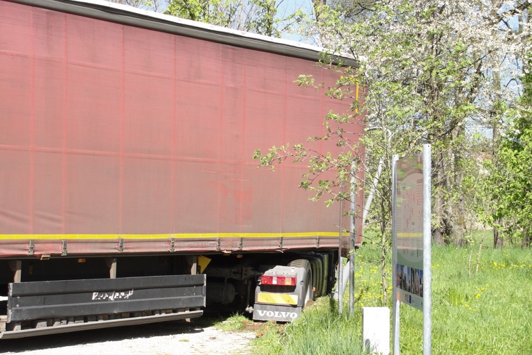 Ein Lastzug auf Abwegen hat heute Mittag mehrere tausend Euro Schaden angerichtet – Bürgermeister Manfred Russer (CSU) hat bereits Anzeige erstattet – Fotos dokumentieren das Malheur