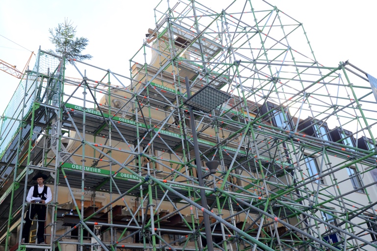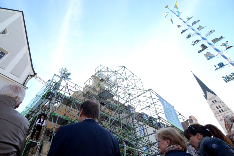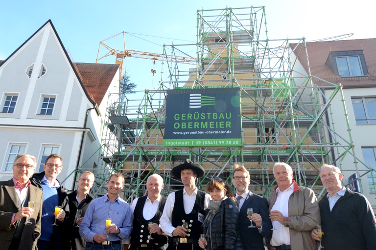 (zel) Ein solches Projekt sorgt freilich für Aufsehen. An dem mächtigen Gerüst am oberen Hauptplatz von Pfaffenhofen kann man gar nicht vorbeischauen. Was hier passiert ist, darf getrost als außergewöhnlich bezeichnet werden. Das legendäre Café-Herb-Gebäude war abgerissen worden, machte einem Neubau-Platz – doch die historische Fassade, die praktisch zum Inventar der Innenstadt gehört, blieb stehen. Sie wurde von eben dieser riesigen Gerüst-Konstruktion gehalten, deren Tage nun gezählt sind. Heute Nachmittag war Richtfest für den neuen Gebäude-Komplex, der da hinter der alten Fassade entstanden ist.
