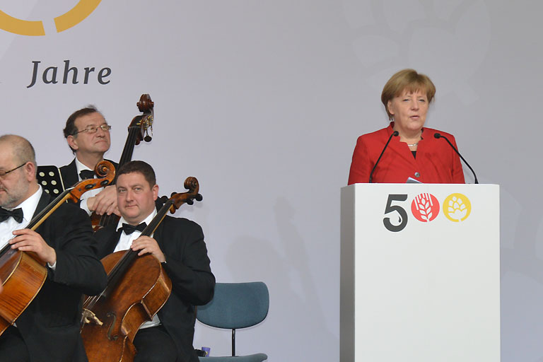 Vor rund 800 Brauern und geladenen Gästen aus Politik und Wirtschaft und vor einer Armada an Pressevertretern gab Angela Merkel in ihrer Festrede ein paar durchaus launige Gedanken zum Besten. Die Politik habe das Bier vor 500 Jahren verträglicher gemacht, meinte sie. Ob allerdings auch das Bier die Politik verträglicher gemacht habe, das sei eine offene Frage. „Das muss ein Gesetzgeber erst einmal schaffen, eine Vorschrift zu machen, die auch 500 Jahre später noch gilt und dann sogar noch groß gefeiert wird. Das Reinheitsgebot ist ein solcher Ausnahmefall“, meinte die Kanzlerin.