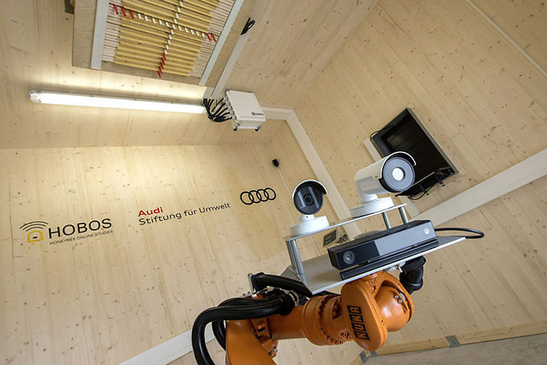Der weltweit erste Hightech‑Bienenstock Smart HOBOS bietet eine völlig neue Herangehensweise an die Verhaltensforschung der zunehmend schutzbedürftigen Honigbiene. Der Bienenstock befindet sich in einem Holzhaus auf dem Gelände der Audi‑Fertigung Münchsmünster. Dort finden die Insekten eine annähernd natürliche Umgebung vor und können so ihr Nest – wie in der Natur – frei bauen. Der Clou: Im selben Raum ist ein um 360 Grad schwenkbarer Roboterarm installiert. Dieser ist mit Infrarot‑ und Wärmebildkameras sowie mehreren 3D‑Sensoren ausgestattet, um so das Treiben in und um den Bienenstock rund um die Uhr zu dokumentieren. Dem Betrachter bieten sich bisher nie dagewesene Einblicke in und auf die Waben – und das, ohne die Bienen zu stören.