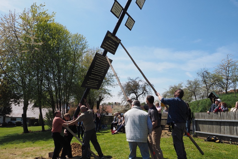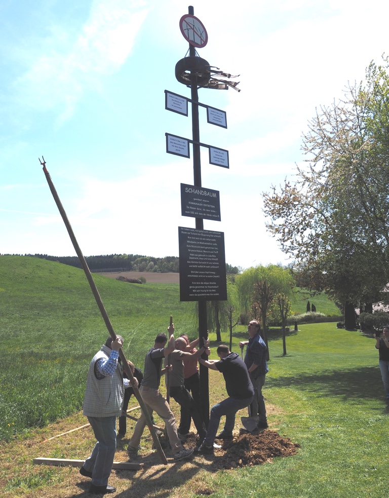(ind) Einen ganz besonderen Stamm hat die Dorfgemeinschaft von Streitdorf bereits am gestrigen Nachmittag in die Vertikale gehievt: Der knapp zehn Meter hohe Schandbaum soll vor allem die Art und Weise des Umganges der Politik mit den betroffenen Bürgern im Zusammenhang mit dem geplanten Windpark anprangern: „Gewidmet unseren KOMMUNALEN VERTRETERN im Namen derer, die dann leiden, wenn DIE sich dann die Hände reiben!“