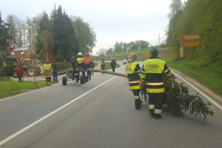Deutlich erfolgreicher und offensivstärker verlief heute das Maibaum-Aufstellen vor heimischem Publikum. Vom Feuerwehr-Vorsitzenden Herbert Hauser gab es ein Sonderlob für die Kicker, die besonders zahlreich aufgelaufen waren, um dazu beizutragen, dass der 34 Meter lange Stamm in die Vertikale gehievt werden konnte.