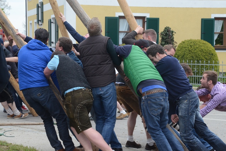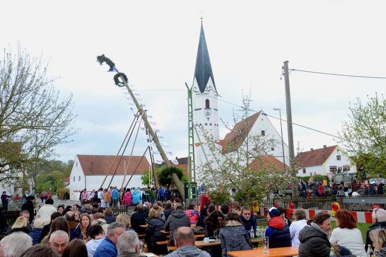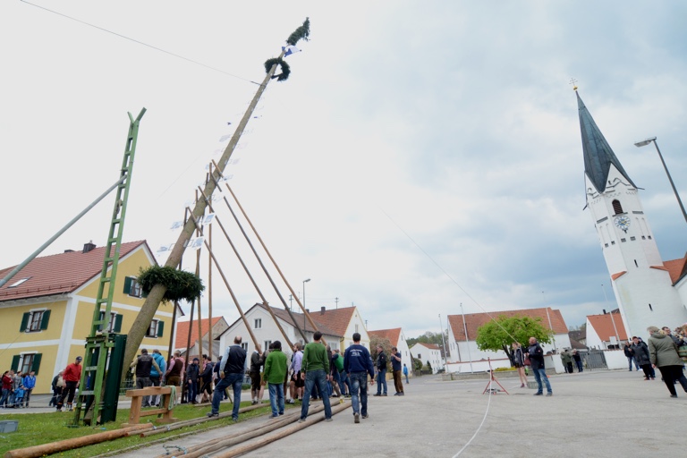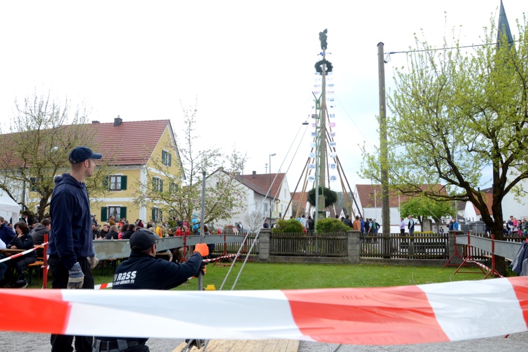 In der Ortsmitte wurde heute der Maibaum aufgestellt: Mit Unterstützung aus der Oberpfalz – und die Fußballer hatten extra ihr Spiel verschoben – Jetzt wird gefeiert